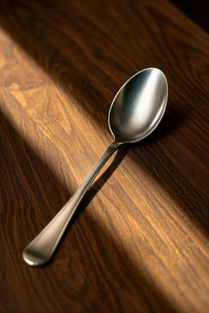 Metal spoon on wooden tabletop