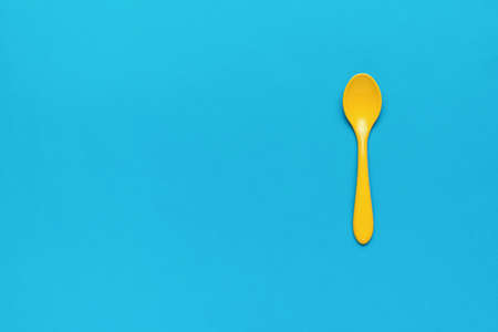 Yellow plastic spoon on a bright blue background. Stylish plastic tableware. flat lay.