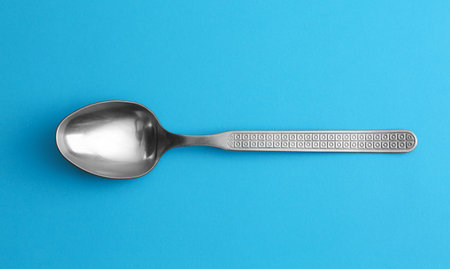 A single shiny spoon lies on a smooth blue background, highlighting its sleek design.