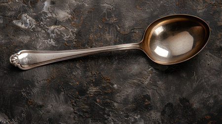 A silver spoon rests on a light surface showcasing its reflective surface and elegant design ideal for kitchen settings or dining.