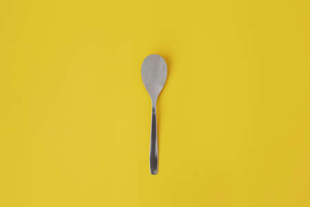 A kitchen spoon lying in the center, on a yellow background, full screen.