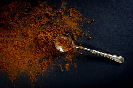 bitter cocoa powder and a silver spoon on a black background. top view