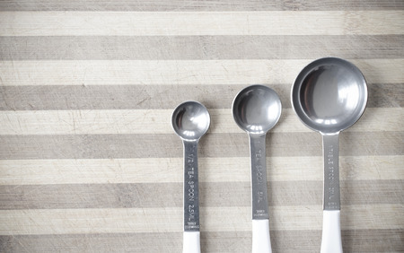 Three measuring spoons on a wooden chopping board background
