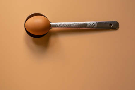 A brown egg in a metallic spoon on a light brown background flatlay