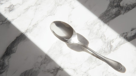 A sleek silver spoon rests on a marble surface, illuminated by natural light. The interplay of shadows creates a serene and elegant kitchen ambiance, perfect for culinary presentations.