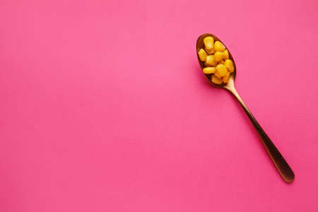 Spoon of corn kernels on color background