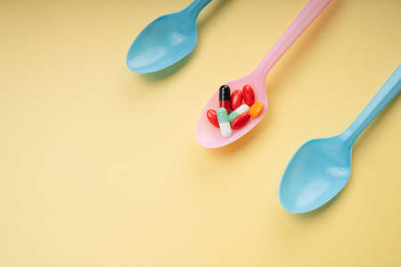 Varity colourful medicine pill capsule on plastic spoon over yellow background.