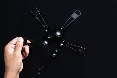 A man hand holding a measuring spoon isolated on Black background.