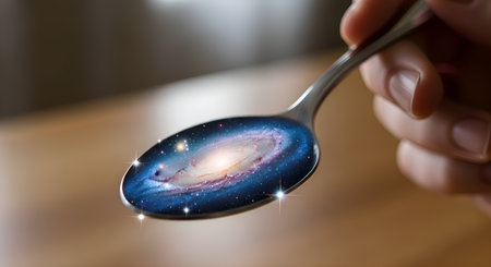 galaxy reflected in a spoon held by a hand