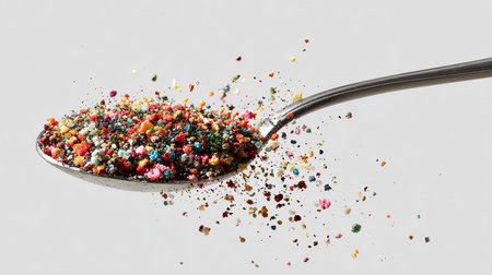 Spoon full of multicolored sprinkles on white background.