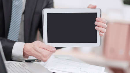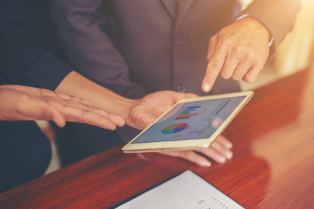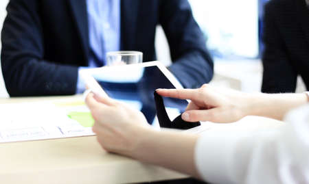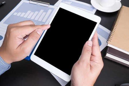 Modern people doing business, graphs and charts being demonstrated on the screen of a touch-pad,blank screen copy space