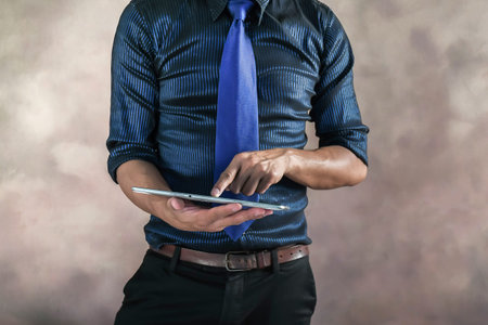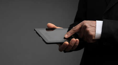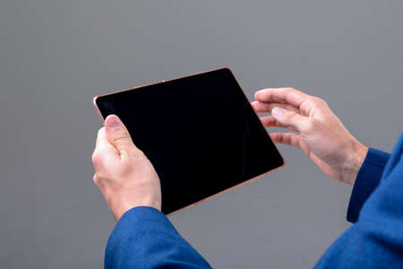 Close-up Of A Businessman Using Digital Tablet On Gray Background