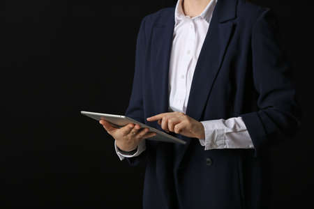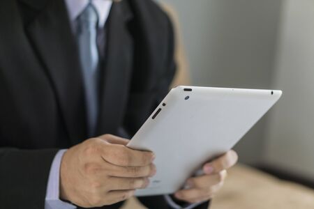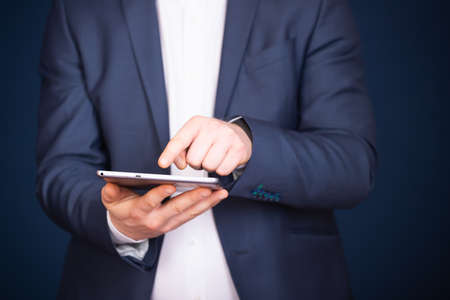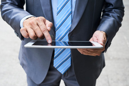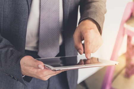 Close-up of businessman in suit standing and touching touchscreen of digital tablet and working or communicating online