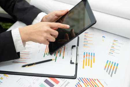 Accounting press tablet with calculator chart graph for working project in modern office.