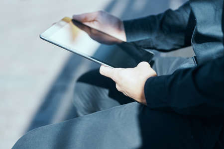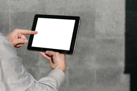 Close-up, finger in front of a tablet screen mockup, in the hands of a businessman. Against the background of a gray concrete wall