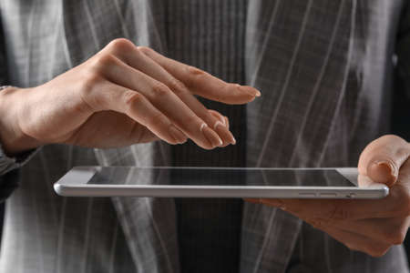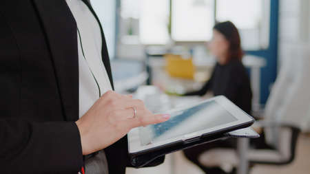 Close up of businesswoman using digital tablet for project planning at corporate office. Person working with device and technology for organization development and management strategy