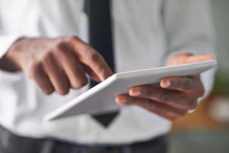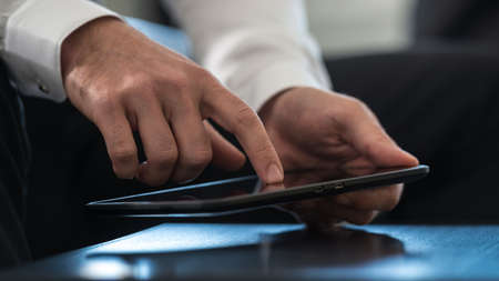 Businessman navigating a tablet computer activating the touchscreen with a finger while surfing the internet or inputting data, close up view of the hands.