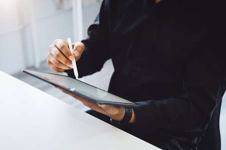 Cropped image of Attractive businesswoman using a digital tablet while sitting in modern office workspace.