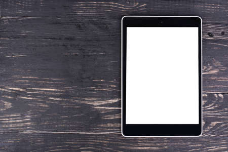 Tablet PC with a blank screen is a dark wooden background