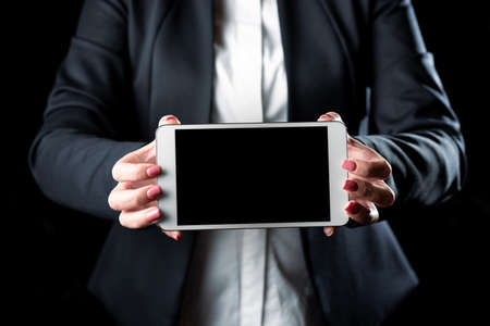 Businesswoman Holding Tablet And Presenting Important Informations On It. Woman Showing Recent Updates On Screen. Executive Displaying Late Achievements On Cellphone.