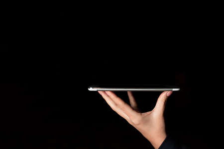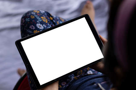 Hand holding digital tablet mockup of blank screen. Take your screen to put on advertising.