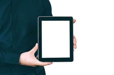 Digital tablet device white screen in male hand over tablet mockup image