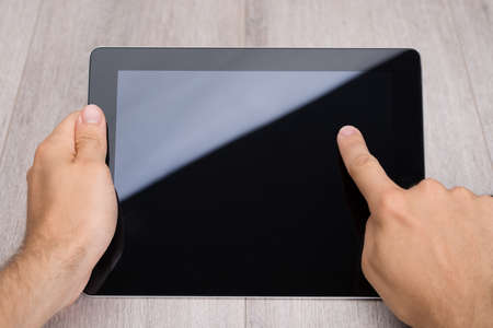 Man using tablet computer while sitting on a wooden floor. View from above. Clipping path included.
