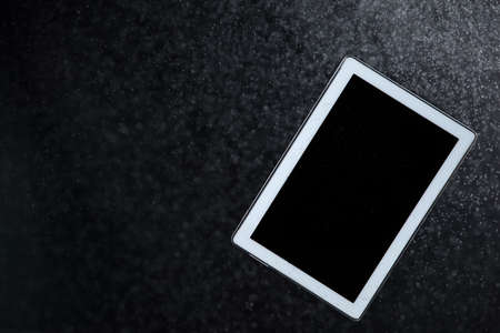 Tablet computer on grey stone background. Isolated white screen with copy space. Empty space for text. Empty blank screen.