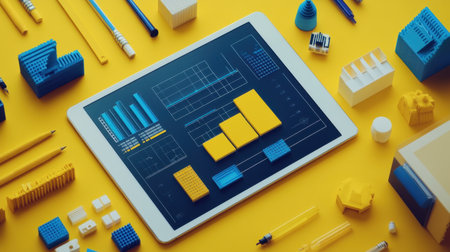 Black digital tablet on bright yellow background, top view, flat lay with copy space
