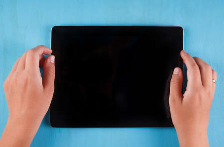 Mobile technology. Digital information. Advertising background. Female hands holding tablet computer with blank white screen isolated black.