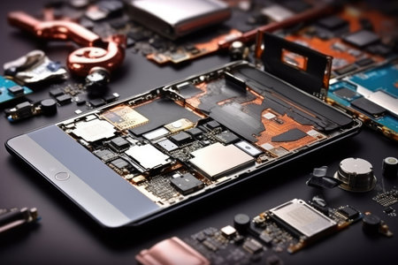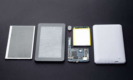 Electronics waste including a lcd screen,a electronic board,a battery,a camera lens and tablet computor on white fur rug background