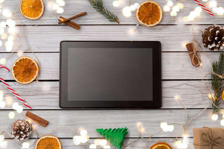 Vintage Tablet mockup flat lay on old table top wood background texture space concept workspace office blank note, plan on calendar new year 2019, e comerce business blogger idea empty wooden view