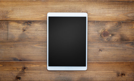 Tablet computer PC with blank screen mock up isolated on red wood table background. Tablet on wood table. tablet white screen