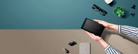 Top view, a digital portable tablet computer white screen mockup on modern dark workspace.
