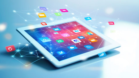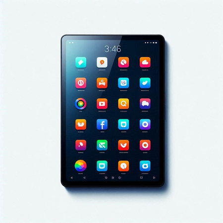 Tablet pc with colorful application icons isolated on white background. 3d rendering