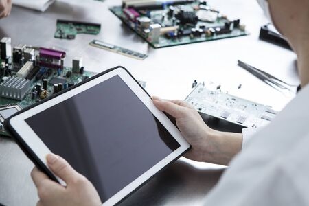 Defocus electronic repair. Technician repairing electronic circuit board with soldering iron. Engineer disassembling components broken smartphone and take off logic board. Out of focus.