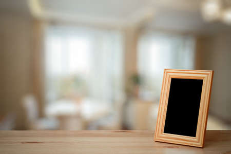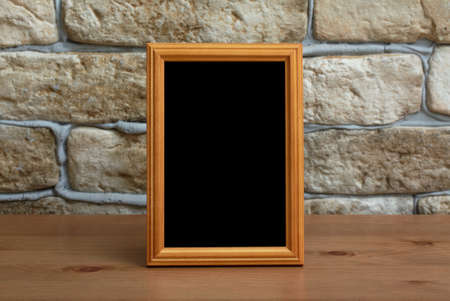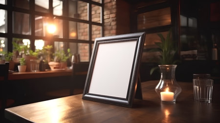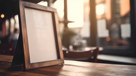 Empty wooden picture frame on a table in a cafe or restaurant.