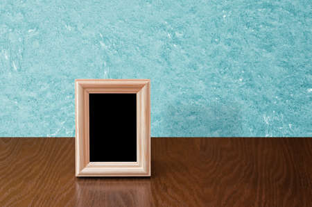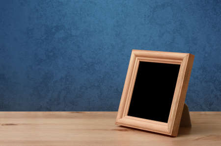 wooden photo frame on table, blue wall