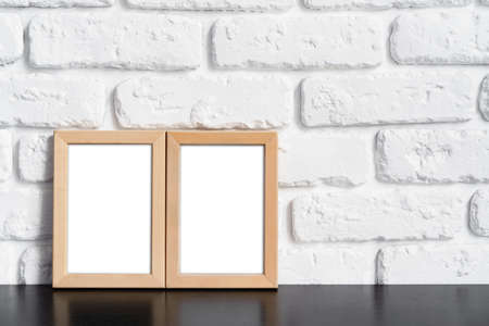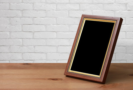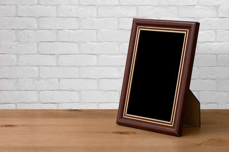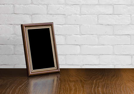 old photo frame on the wooden table, white brick wall