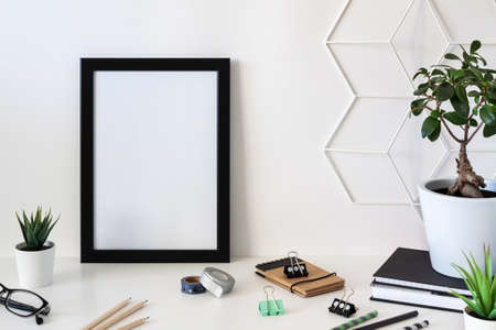 School desk against an empty white wall. Copy space. Office supplies. Plants in pots, geometric texture and glasses. Black frame mockup.