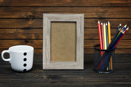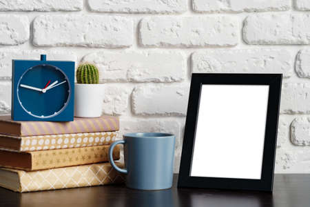 3d picture frame with cup and book on wood top table. 3d rendering, illustration