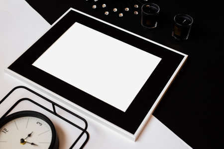 Picture frame mockup, office stationery, cup of coffee, books on white table. Elegant modern workspace, nordic style.