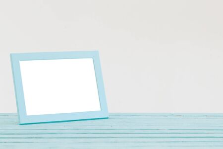 blue wooden frame on table on background white wall