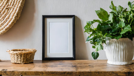 Blank picture frame mockup on the wooden table with plant in vase