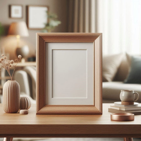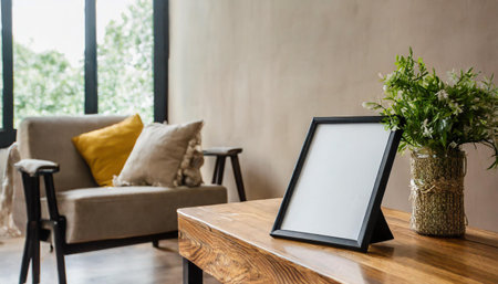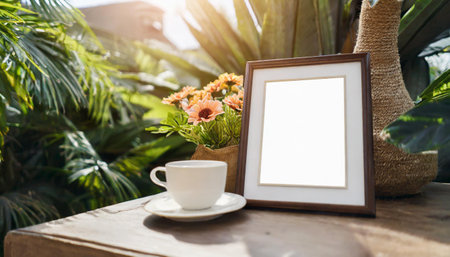 blank photo frame with coffee cup on table in living room at home
