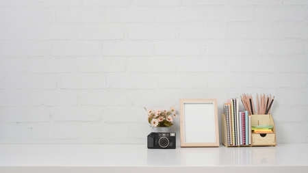 Close up view of trendy workspace with mock up frames, coffee cup, pencils and decorations on white wooden table with white wall background