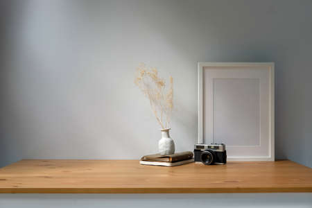 Wooden frame mockup with vintage camera, coffee cup and books on grey background