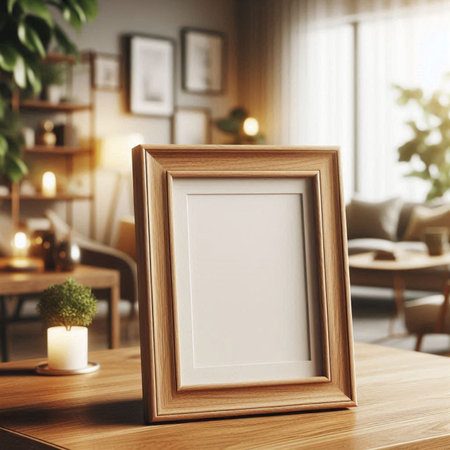 An empty wooden photo frame on a table or shelf with a copy of the space.