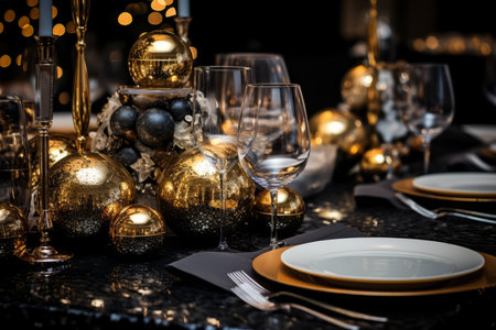 A Lavish New Year's Eve Celebration Table Setting, Adorned with Elegant Glassware, Sparkling Decorations and Festive Party Favors