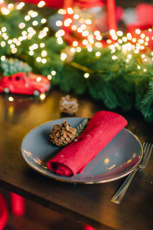 Stylish Christmas design with green napkin decorated with a sprig with berries and fir branch, red plates on wooden table. Xmas or New Year Concept. A table set for a holiday meal.
